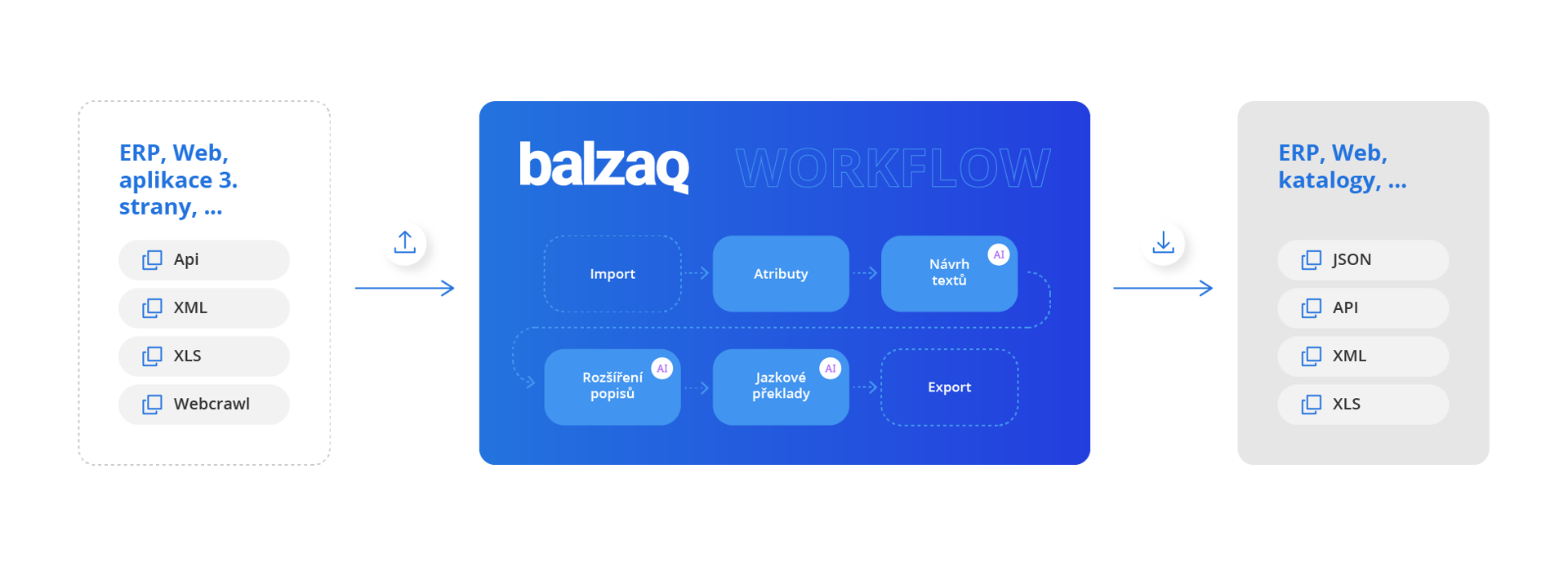 Nástroj Balzaq umožňuje importovat data přes produktový feed, formáty CSV, XLS. Stejným způsobem pak můžete data exportovat zpět do ERP systému.