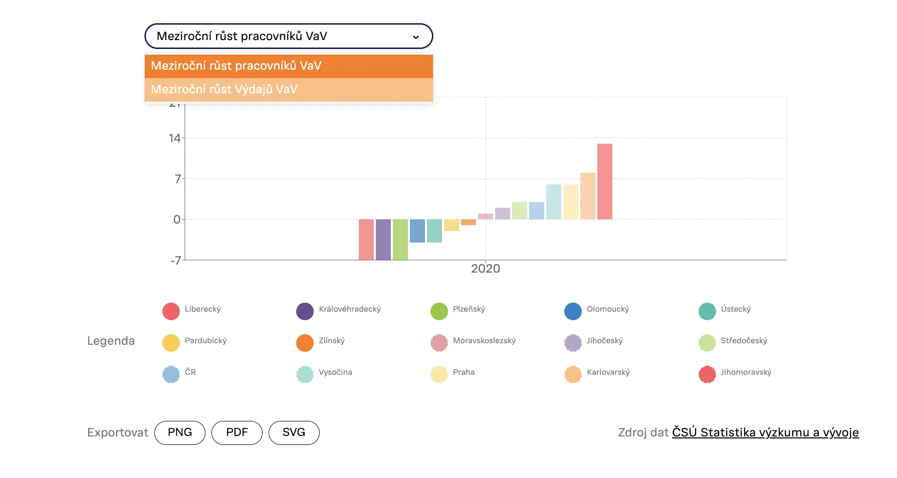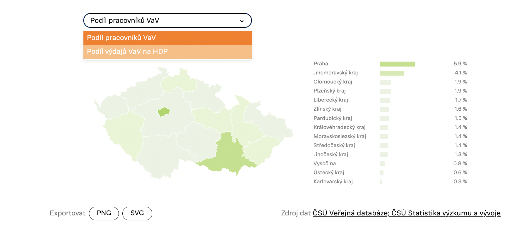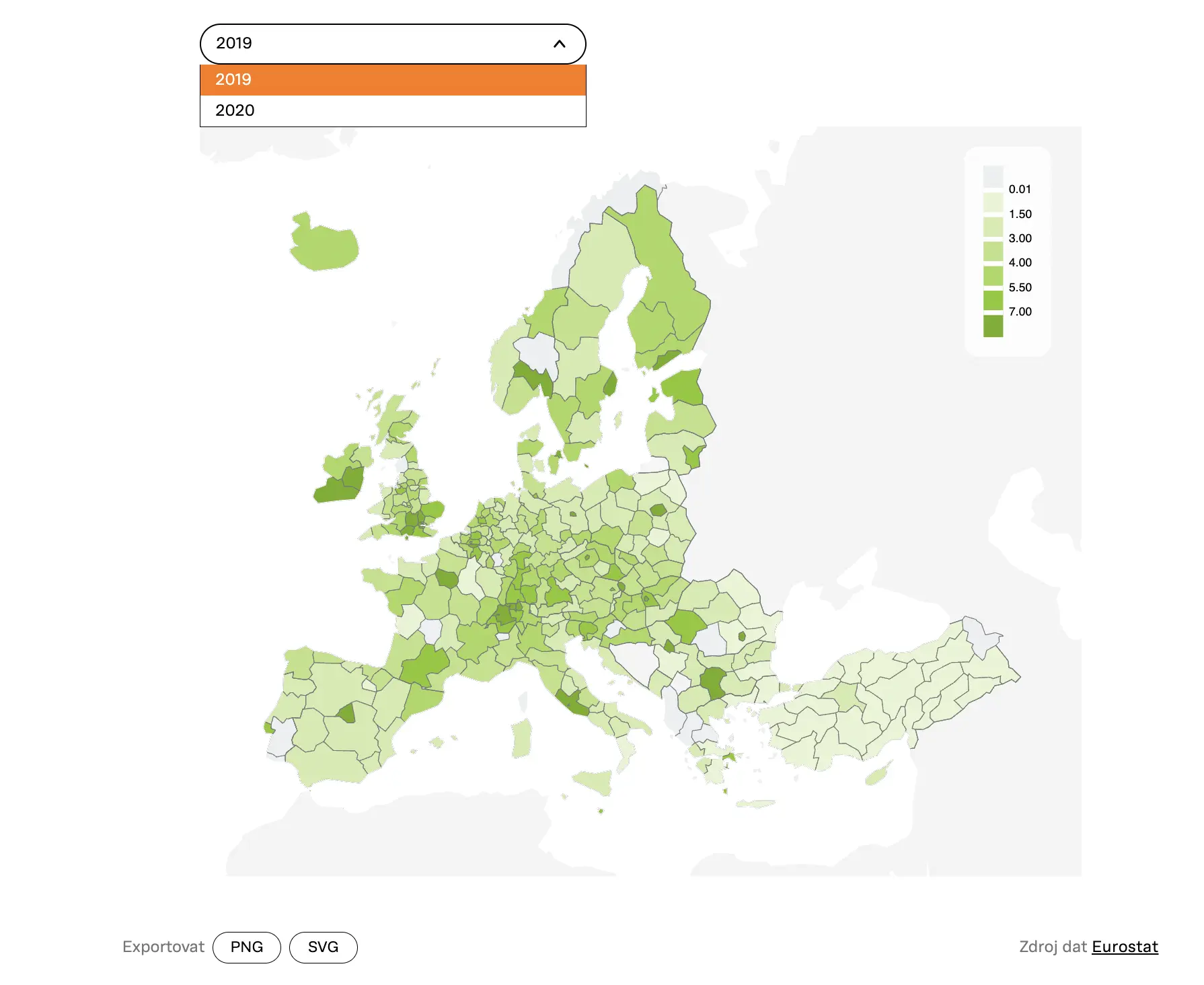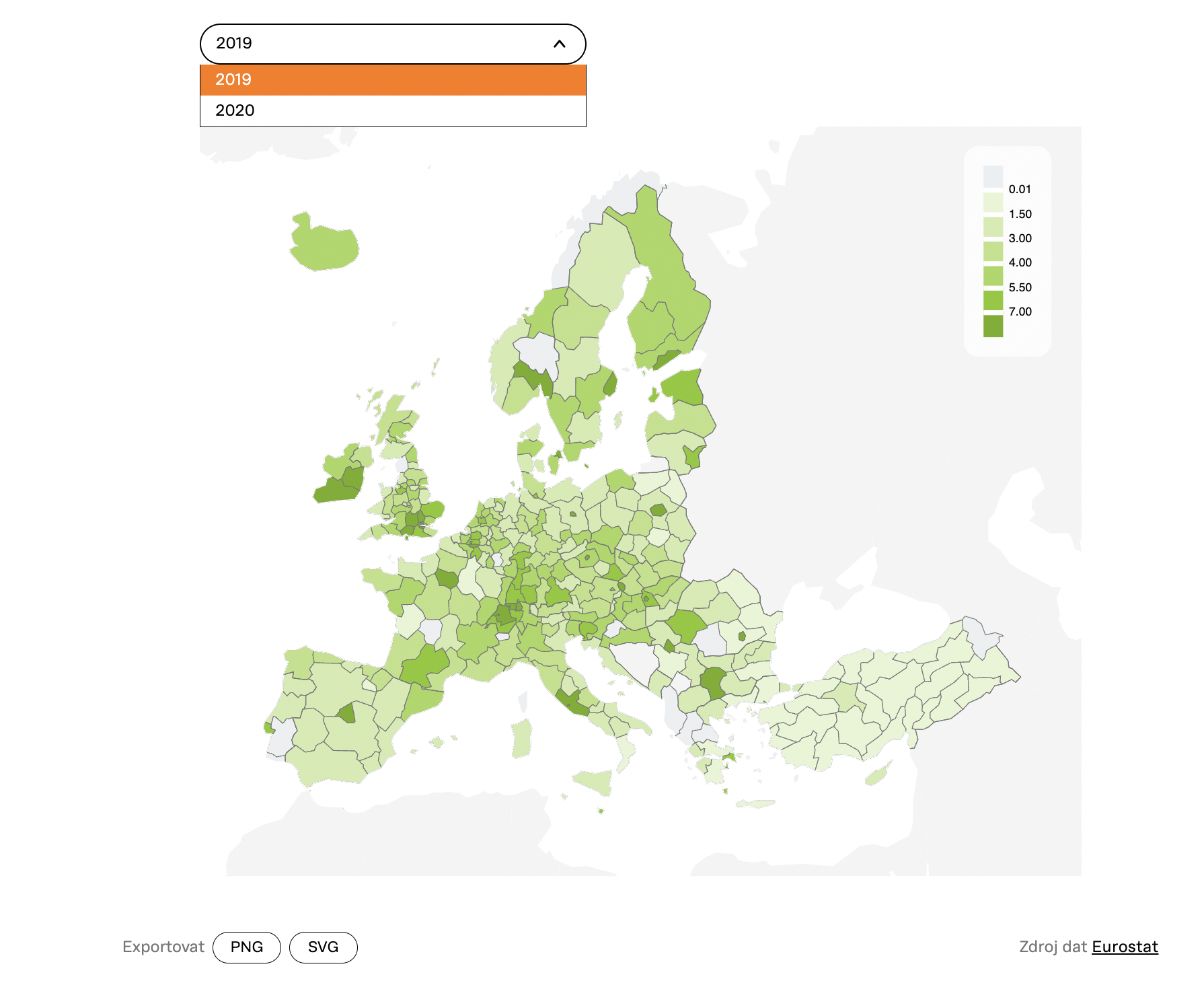 - Nájezdová mapa, která ukazuje konkrétní čísla v jednotlivých krajích
