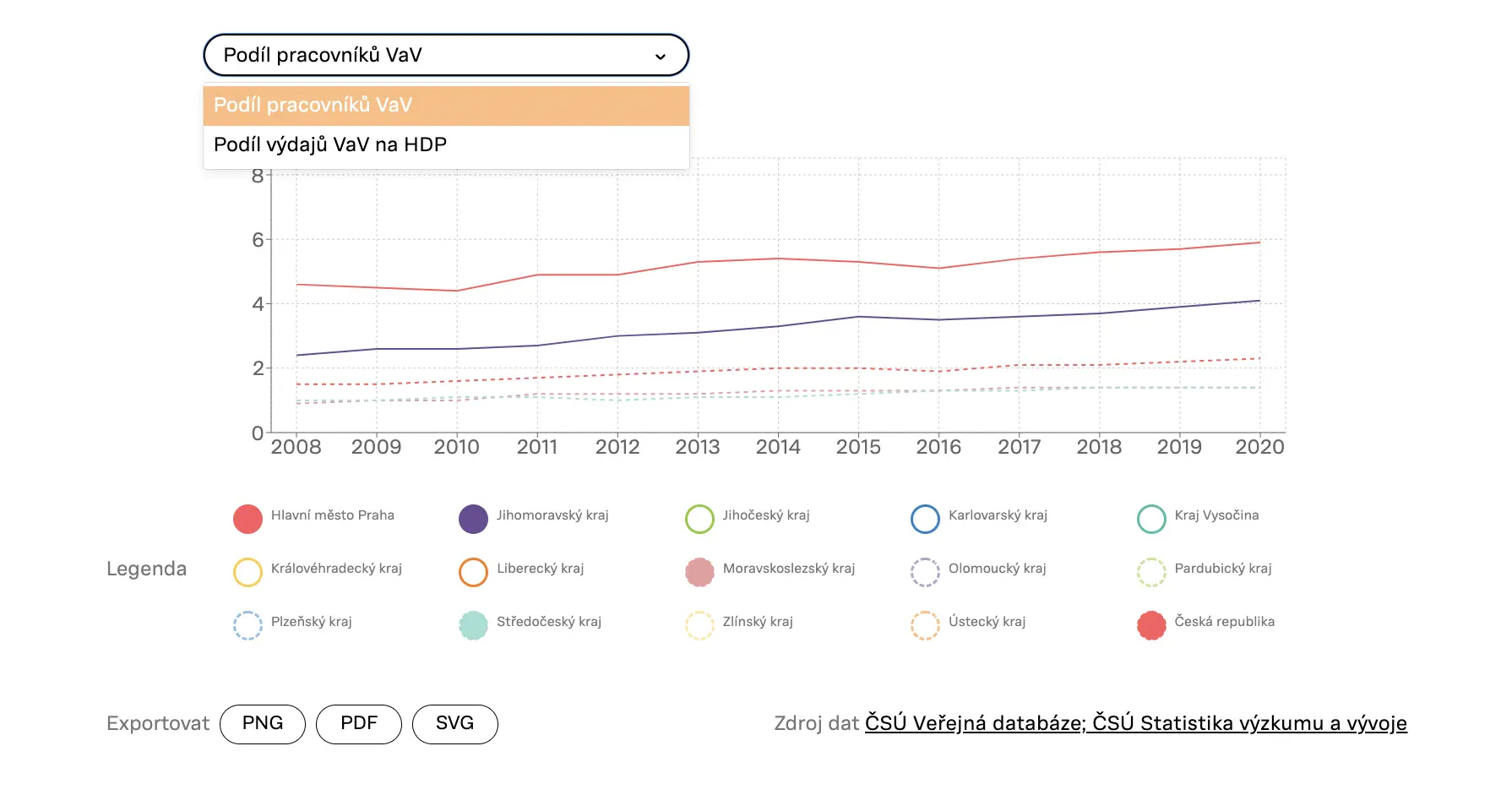 - Po najetí myší na linii se zobrazí konkrétní čísla v uvedených letech