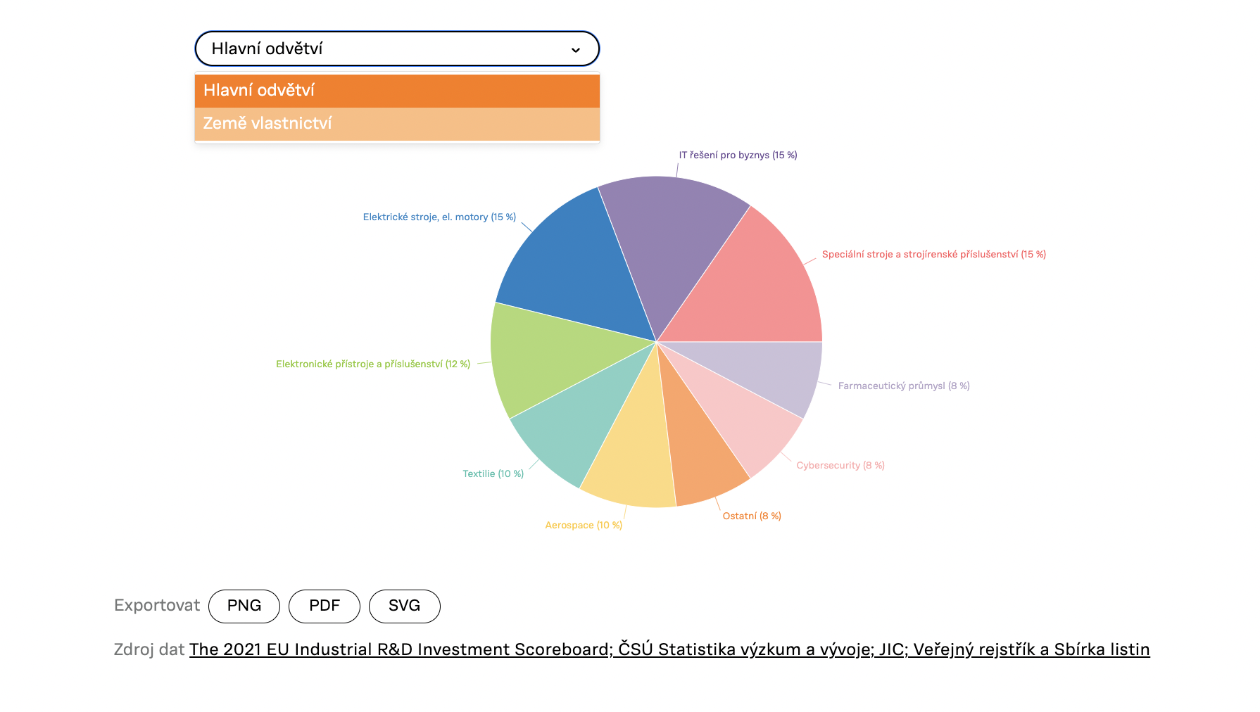 - Po najetí myší na výsek se zobrazí konkrétní počet firem, které se odvětví věnují