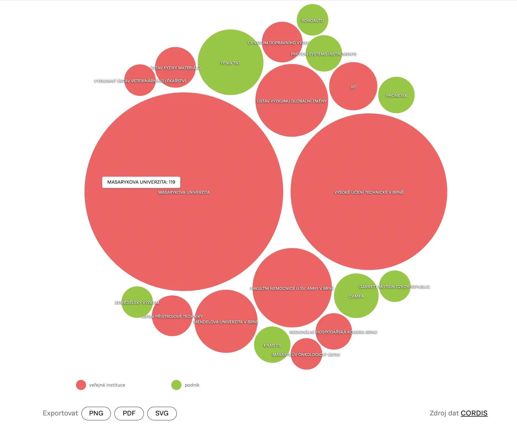 Bubliny znázorňující počet projektů v Jihomoravském kraji v jednotlivých organizacích