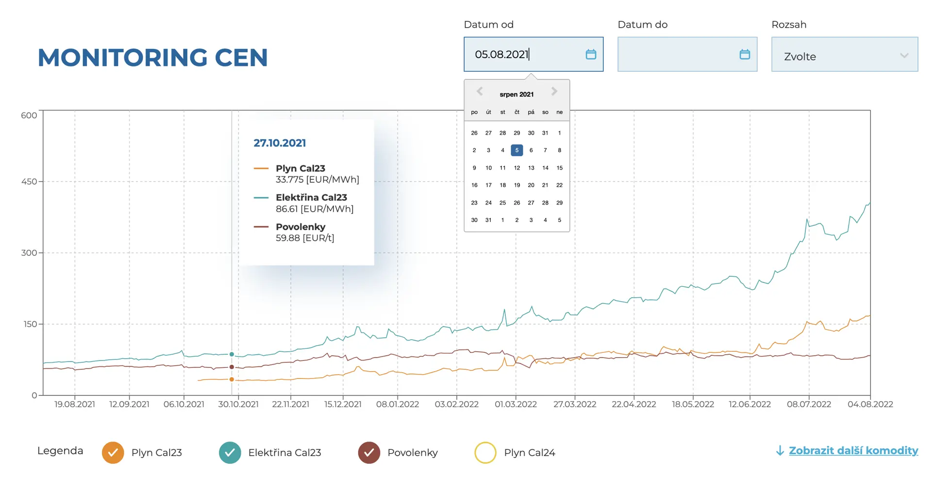 Poradenská společnost v oblasti energetiky EGÚ Brno má od nás nejen zbrusu nový web, ale vsadila i na vizualizace. Například zobrazení monitoringu cen plynu a elektřiny nabízí klientům zvolit si přesné či předvolené období nebo filtrovat konkrétní typ komodity. Na závěr si konkrétní data můžete i stáhnout, abyste je měli kdykoliv k dispozici – i když budete offline.