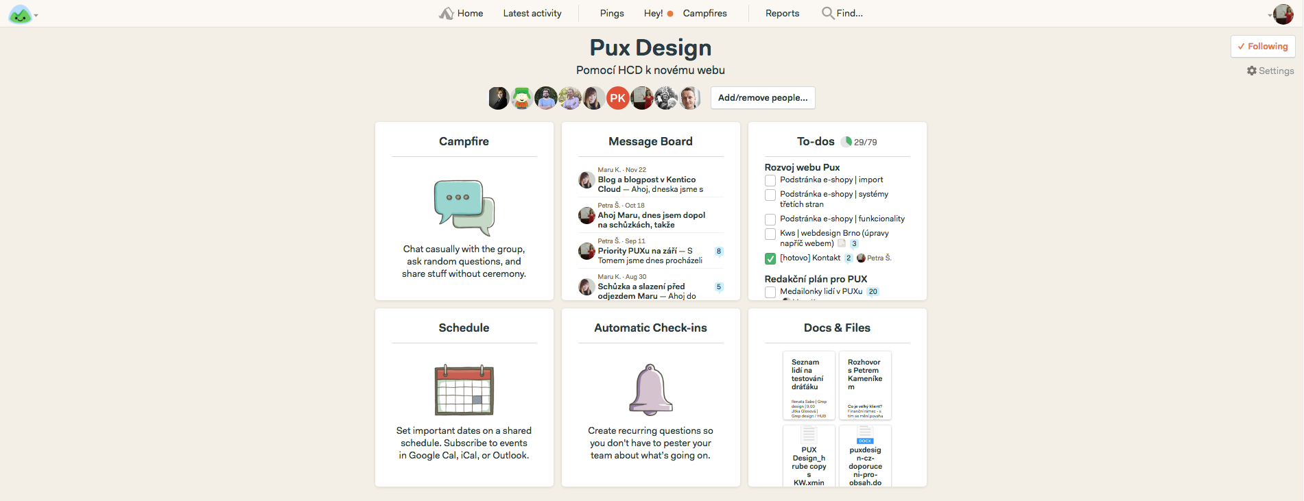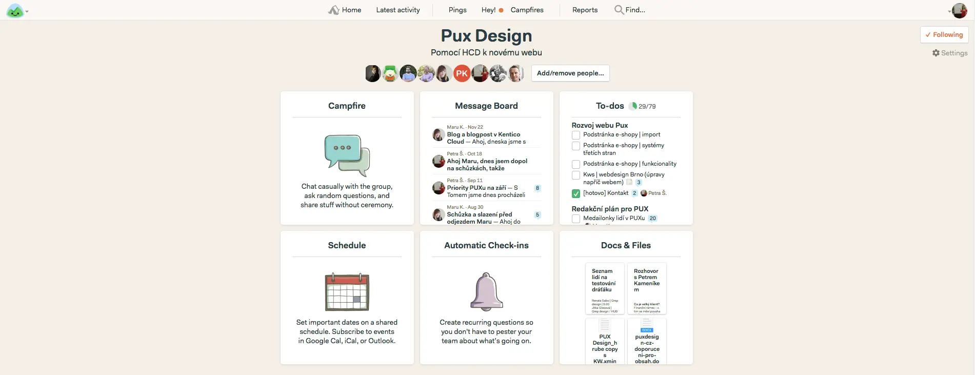 Celý projekt řešíme v Basecampu, díky kterému mají všichni přehled, co je hotovo a na čem se právě pracuje.