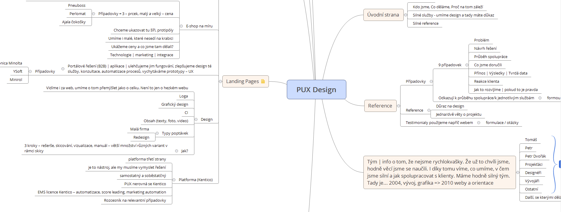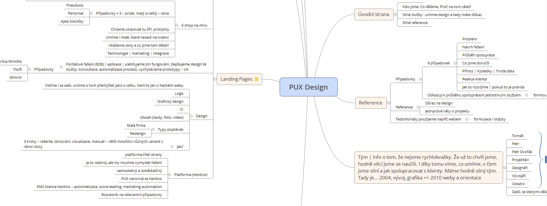- Kdo jsme , která klidně mohla vypadat úplně jinak, ale z rozhovorů vyplynulo, že naši klienti výrazně vnímají osobu Toma jako tvář firmy a člověka, který s nimi od začátku komunikuje. Stránku jsme tak postavili na představení tří lídrů v PUXdesign.