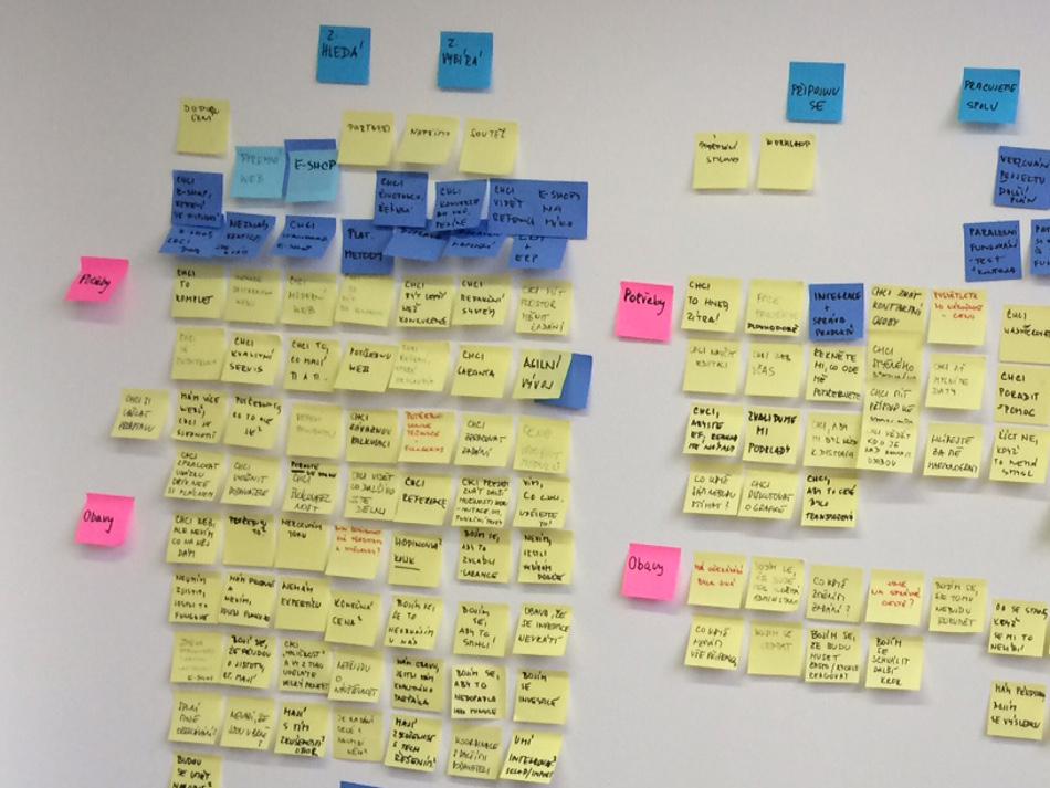 S hromadou dat jsme se zavřeli do zasedačky v HUBu a Roman začal rozdávat úkoly. Ze všech rozhovorů jsme nejprve vypreparovali potřeby, obavy a touhy přesně tak, jak je naši klienti popsali. Roztřídili jsme je do 6 tematických okruhů, ze kterých vyplynulo, že se zaměříme na popis dvou person, které mají některé věci společné, ale v jiných se naprosto rozcházejí. Získali jsme tak představu, jak k jednotlivým stránkám přistupovat. Konkrétně se to odrazilo například na stránce: