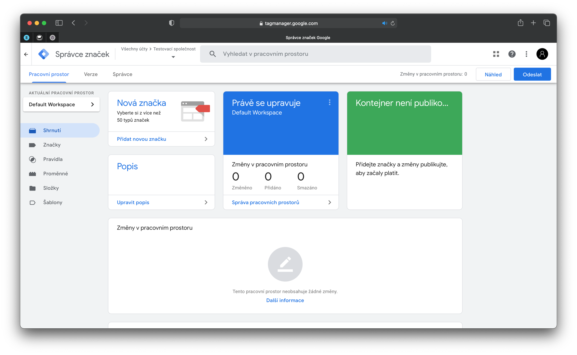Značky: zde spravujete všechny skripty externích nástrojů, implementujete Google Analytics a další služby Google, definujete události, konverze a další.