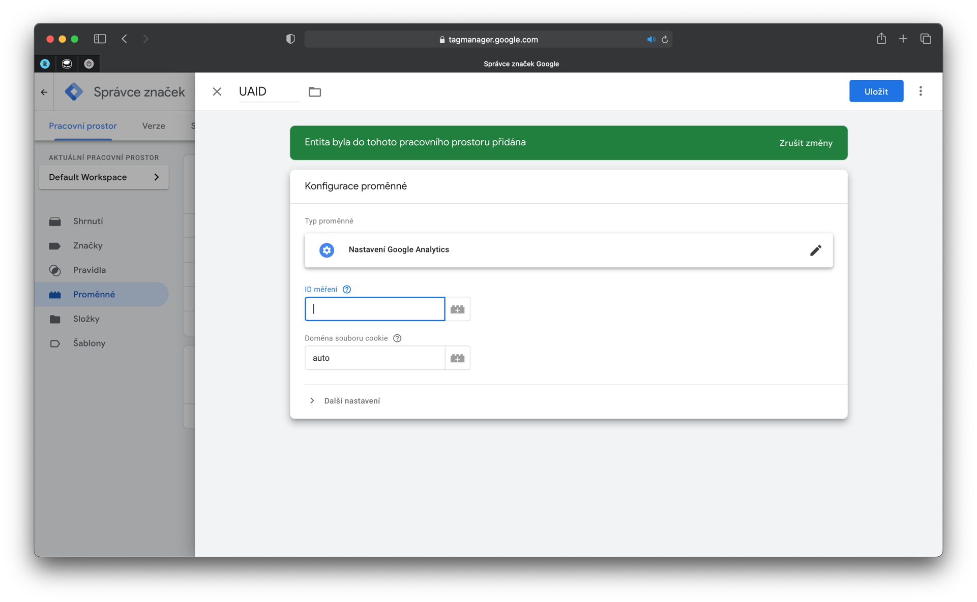 A jdeme na samotné nastavení. Zkopírujte si číslo účtu Google Analytics, přejděte do Proměnných a v poli Proměnné definované uživatelem klikněte na Nová. Novou proměnnou pojmenujte UAID. Klikněte na možnost vybrat typ proměnné a vyberte typ Nastavení Google Analytics. Do pole ID měření vložte číslo účtu Google Analytics a klikněte na Uložit.