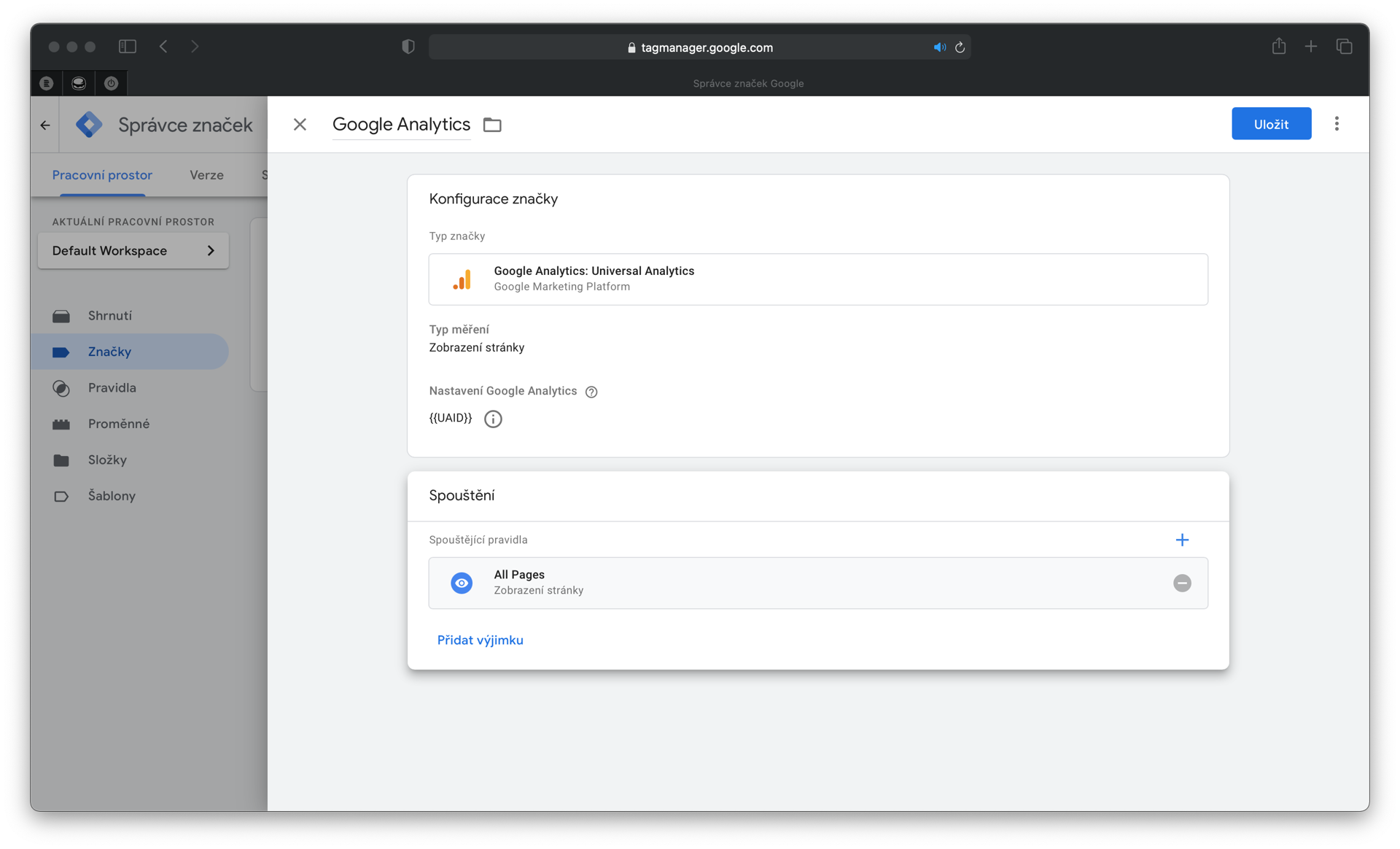 Přejděte na Značky a klikněte na Nová. Pojmenujte ji Google Analytics. Klikněte do Konfigurace značky a vyberte Google Analytics (Universal Analytics). V nastavení Nastavení Google Analytics vyberte proměnnou, kterou jsme si vytvořili — UAID. Klikněte do Spouštění a vyberte All Pages. Klikněte na Uložit.