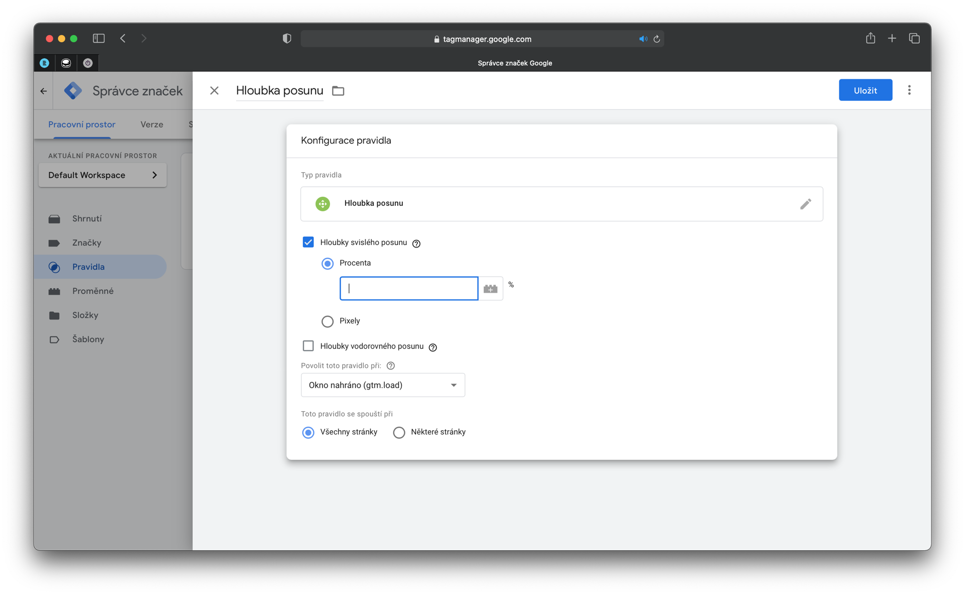 Pravidla: značky se spouští na základě pravidel. Ať je to kliknutí na tlačítko, scroll na stránce, zobrazení stránky a podobně. Tato pravidla definujete zde.
