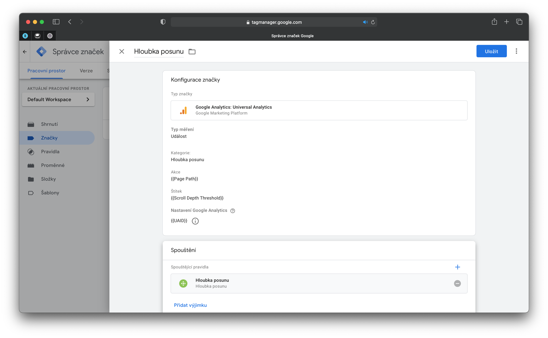 V nastavení značek vytvořte novou značku. Pojmenujte ji Hloubka posunu. Kliknutím do konfigurace značky vyberte Google Analytics (Universal Analytics) a jako Typ měření zvolte Událost. Do pole Kategorie vložte Hloubka posunu. V poli Akce klikněte na ikonu Lega se symbolem plus a následně Page Patch. Na tutéž ikonu klikněte u pole Štítek a vyberte Scroll Depth Threshold. V Nastavení Google Analytics vyberte UAID. Nakonec klikněte do Spuštění a zvolte pravidlo pro spuštění Hloubka posunu. Klikněte na Uložit.