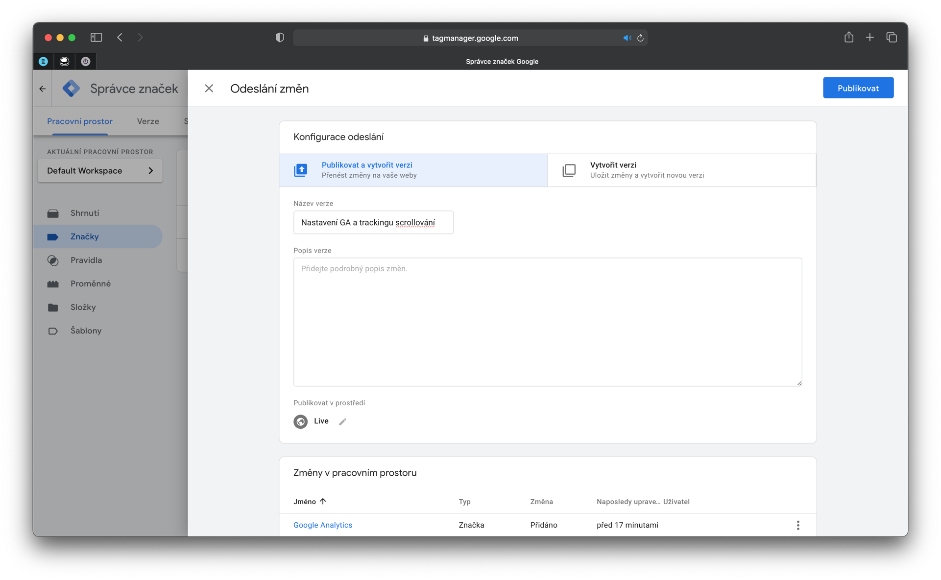 V pravém horním rohu se nabízí možnost Náhled a možnost Odeslat. Prostřednictvím funkce Náhled si můžete zobrazit a ověřit, jak funguje nastavení provedené v Google Tag Manager ještě dříve, než ho zveřejníte. Jakmile jste si jisti, že provedené úpravy chcete zveřejnit, klikněte na Odeslat. Do názvu verze zadejte popis úprav, které jste provedli, a klikněte na Publikovat.