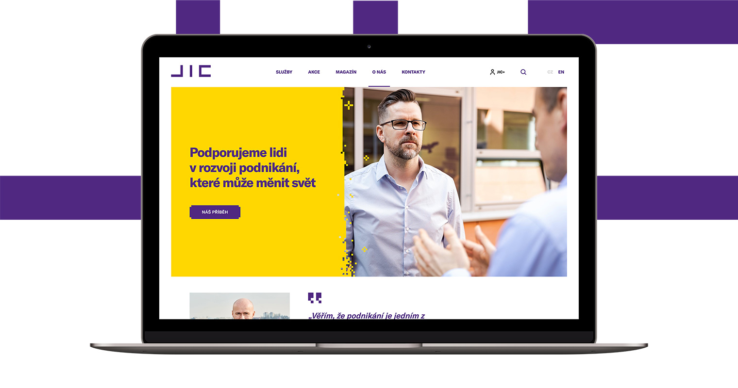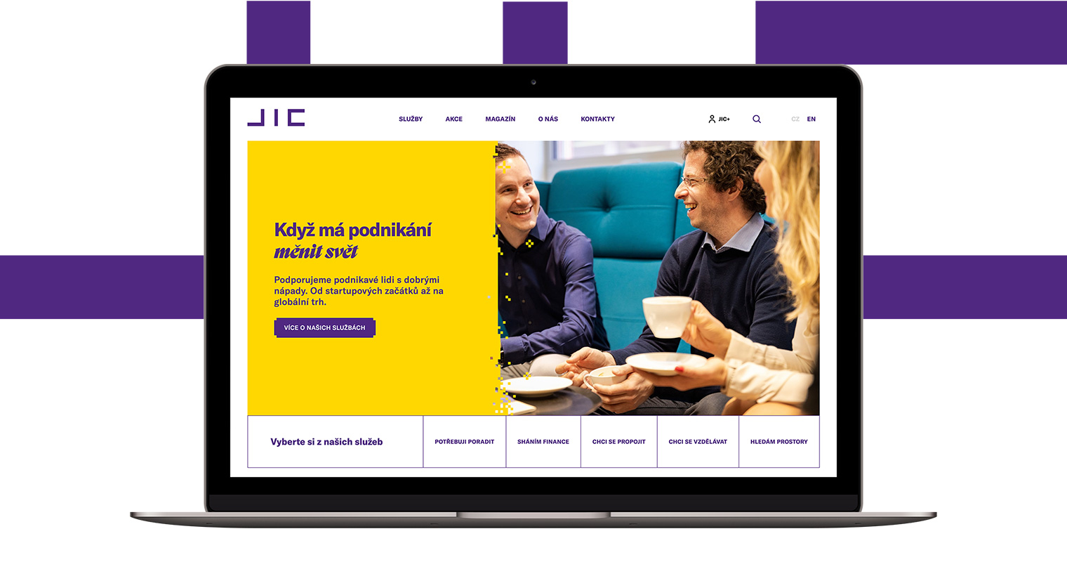 JIC (Jihomoravské inovační centrum) podporuje lidi v podnikání, které může měnit svět. K jeho klientům patří jak začínající startupisté, tak zavedené firmy z jihomoravského regionu. Jedním z klíčových prezentačních nástrojů JICU jsou jeho webové stránky. S novým vizuálem se rozhodl redesignovat i webové stránky a přejít na profesionálnější řešení. Proměnili jsme je proto ve hravý moderní web reflektující značku JIC.