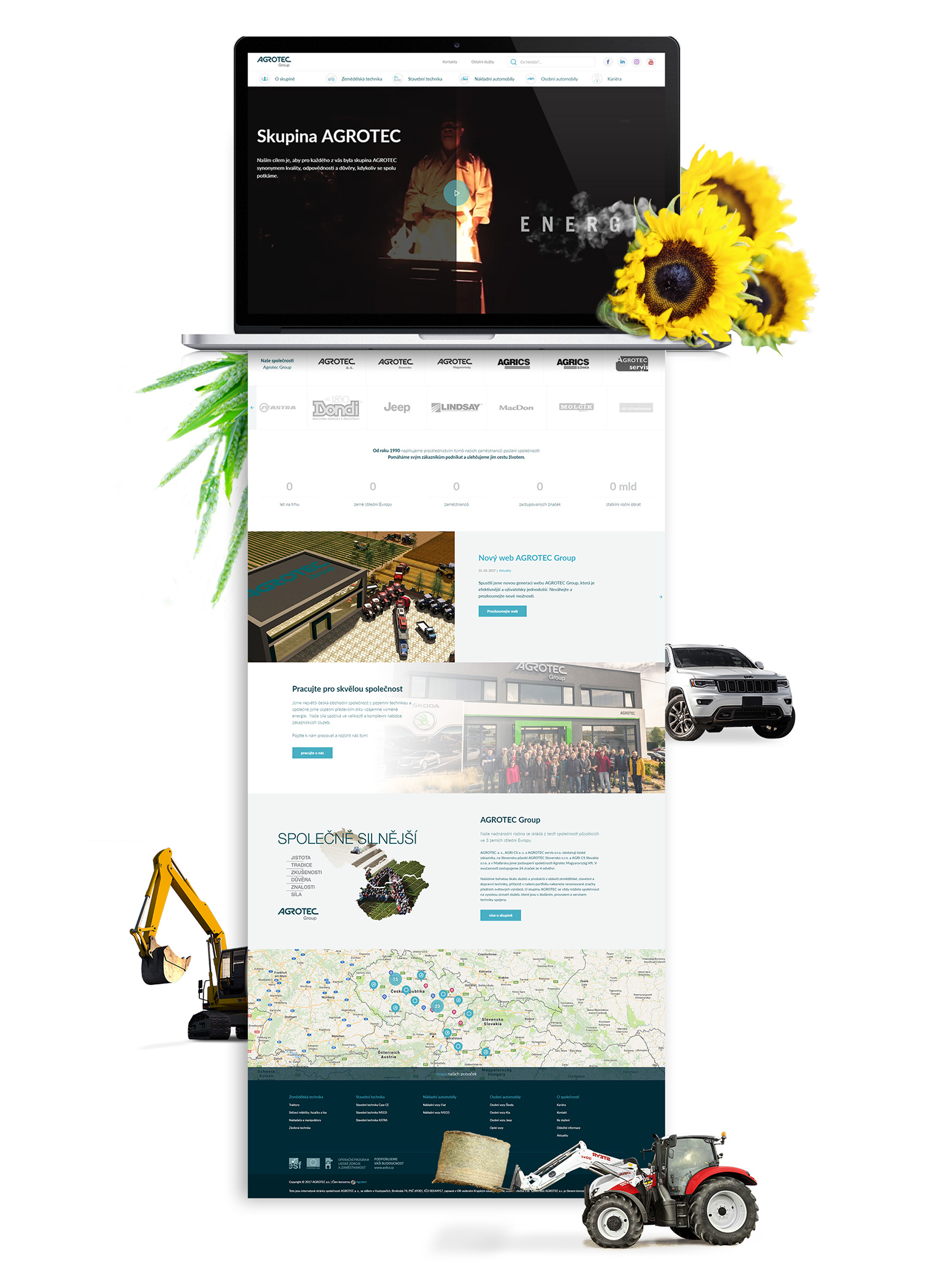 Od roku 2017 jsme hlavním dodavatelem webů pro skupinu AGROTEC, která se zabývá dovozem a distribucí osobních i nákladních automobilů a také zemědělské a stavební techniky. Cílem projektu je od začátku sjednotit vizuál, technické pozadí korporátních webů a dlouhodobě je udržovat a rozvíjet.