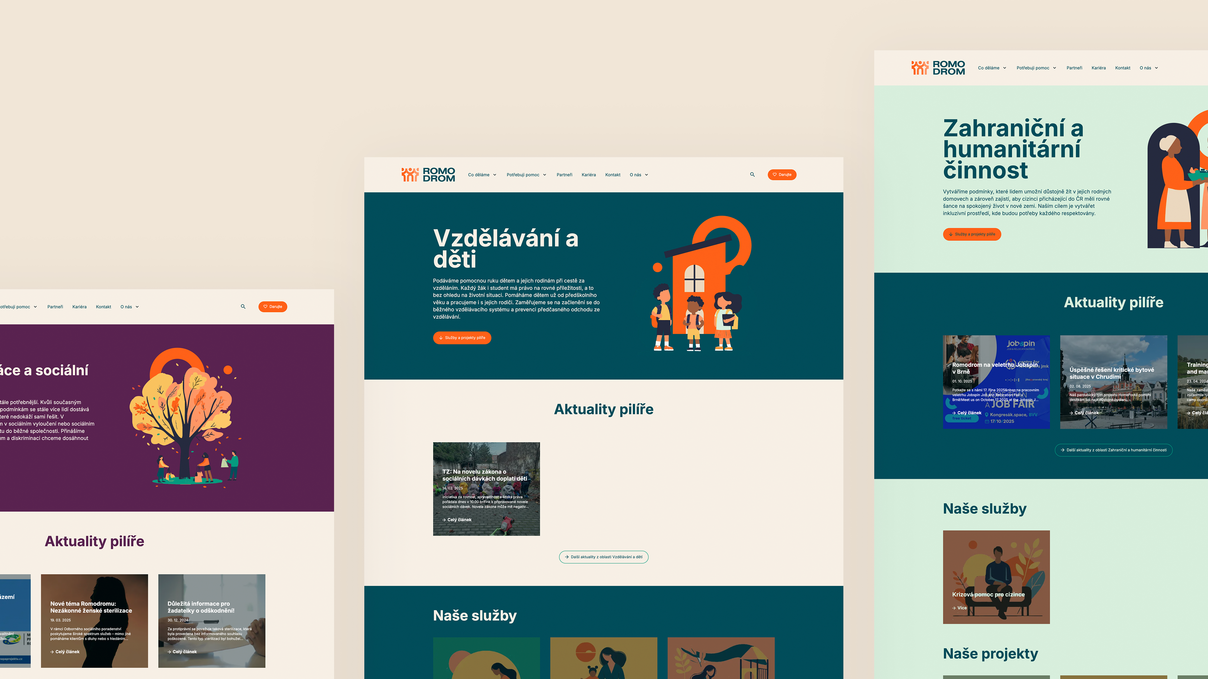 Jednotlivé oblasti pomoci – sociální práce, bydlení, vzdělávání, vězeňství nebo humanitární činnost – mají vlastní barevné sekce a fotky z terénu. Návštěvník tak rychle pozná, v jaké části webu se pohybuje, aniž by musel pečlivě číst každý nadpis.
