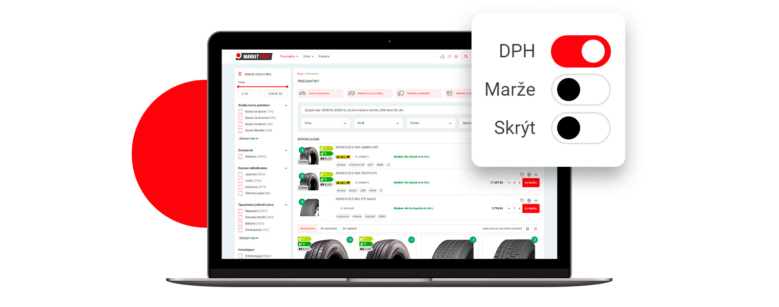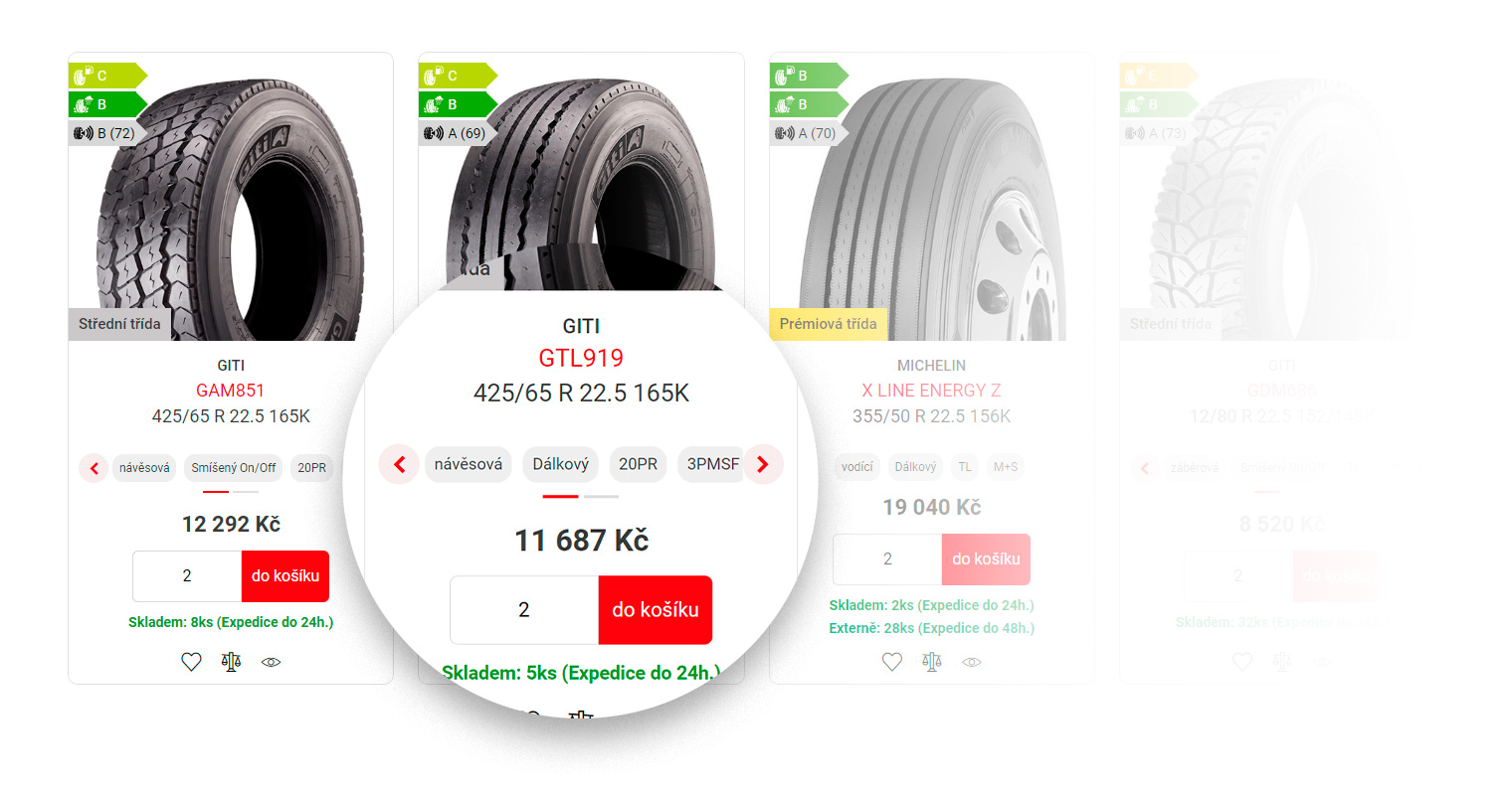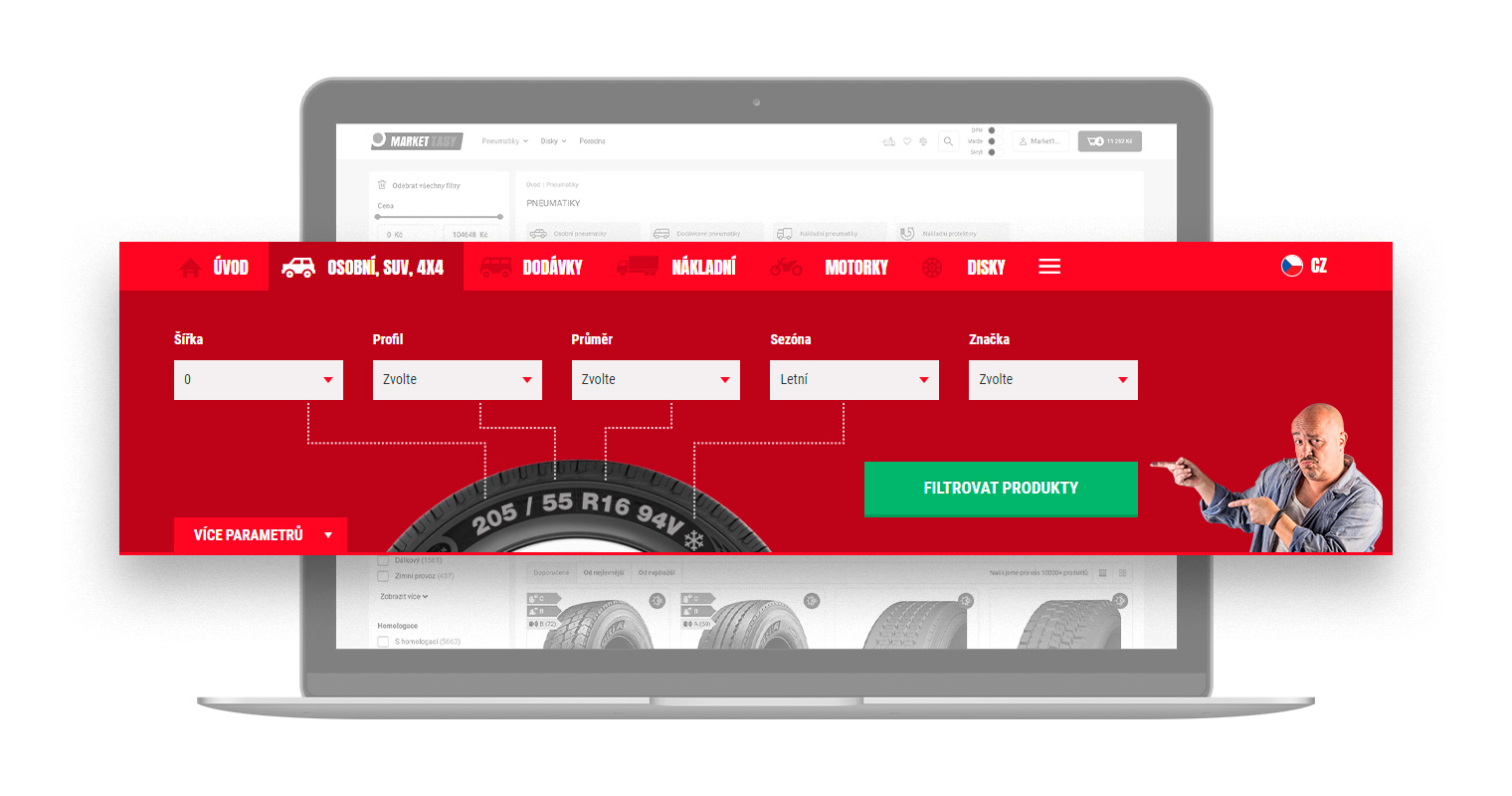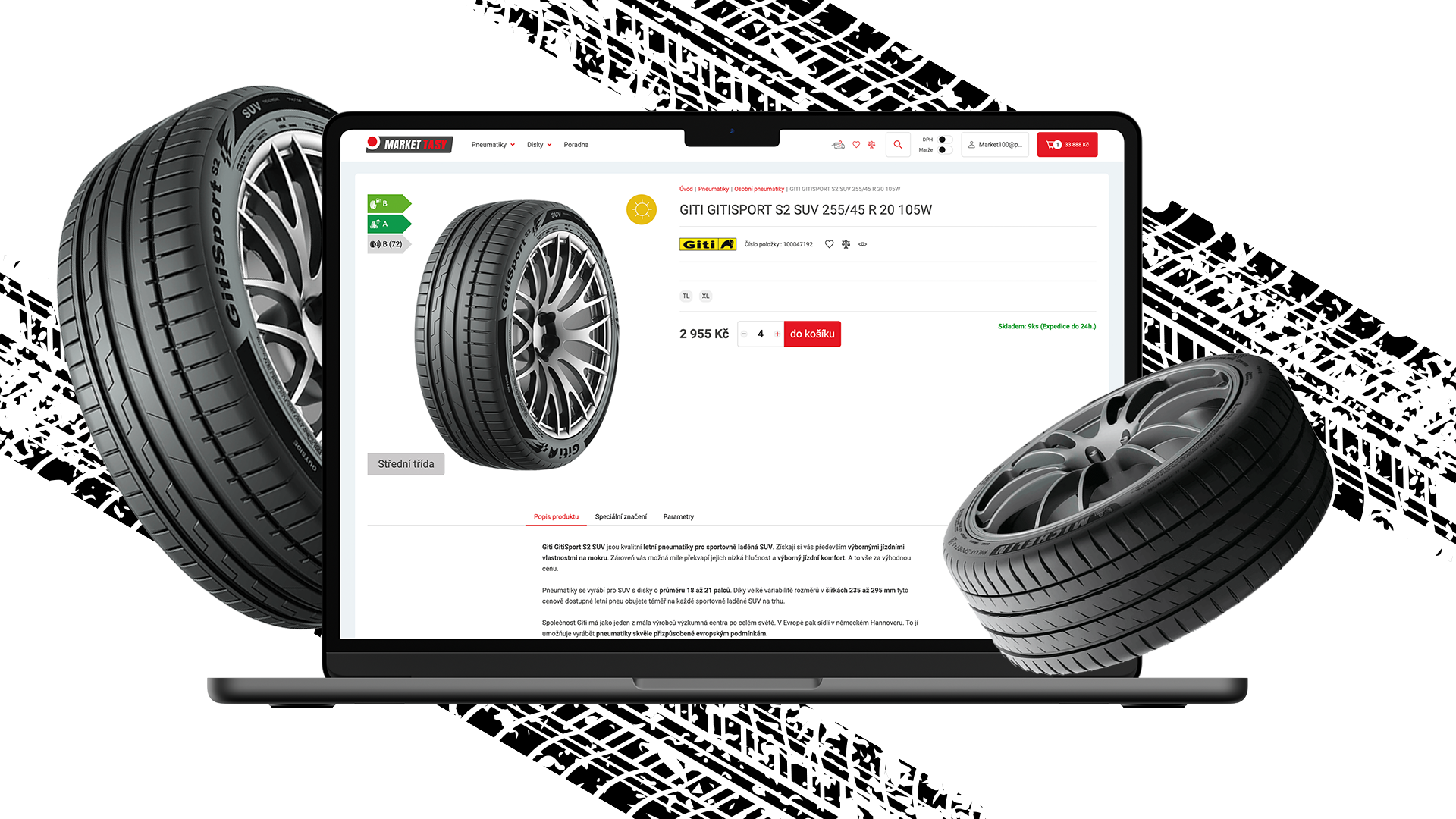 Co klienty TASY Marketu zajímá především, je nabídka pneumatik a jejich dostupnost. Proto právě sklady byly velkým tématem. Sami si můžete všimnout, že e-shop zobrazuje dva typy skladovosti: přímo skladem a externě skladem. Odlišná je i rychlost expedice pneumatik. Je to z toho důvodu, že jsme napojovali nejen informace o skladovosti z klientova ERP.