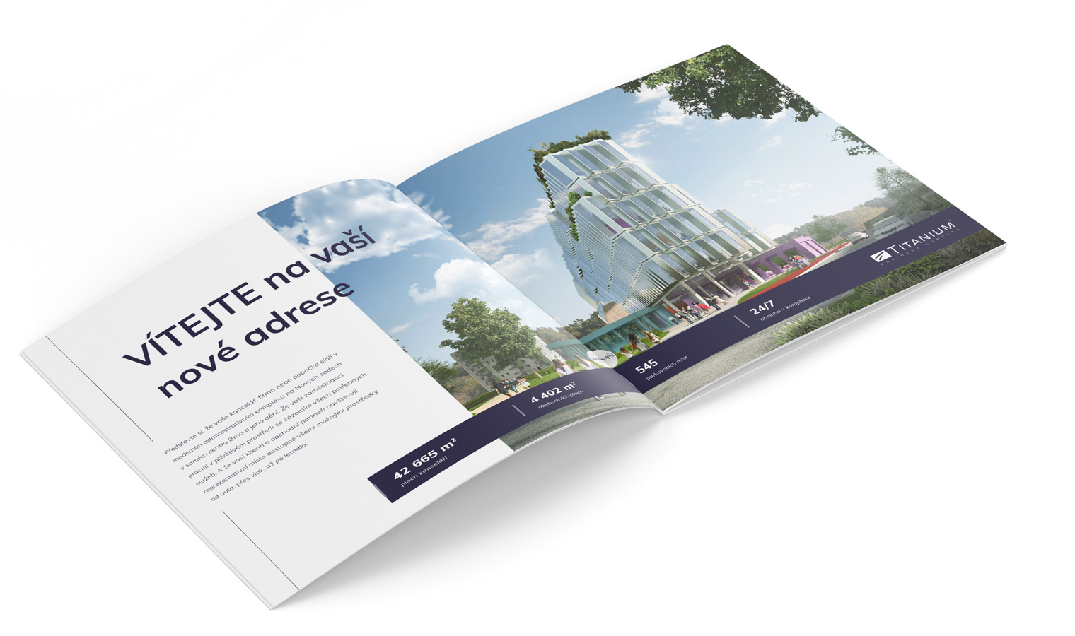 Komplex administrativních budov Titanium má své místo v centru Brna. Tento developerský projekt si zakládá na moderním pracovním prostředím s možností odpočinku v relaxační zóně. V roce 2020 začaly vedle stávajících budov vyrůstat další přístavby. A právě tehdy nás klient oslovil – potřeboval totiž vytvořit propagační brožuru včetně kvalitních vizualizací, kterými by zaujal potenciální zájemce o pronájem vznikajících kancelářských prostor.