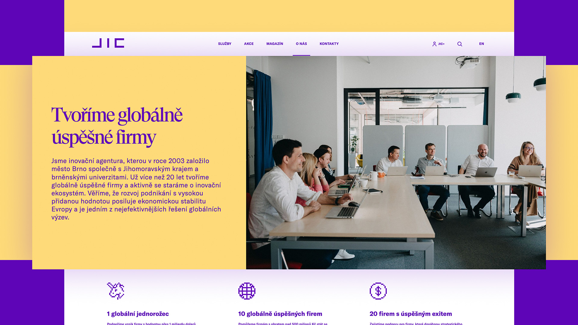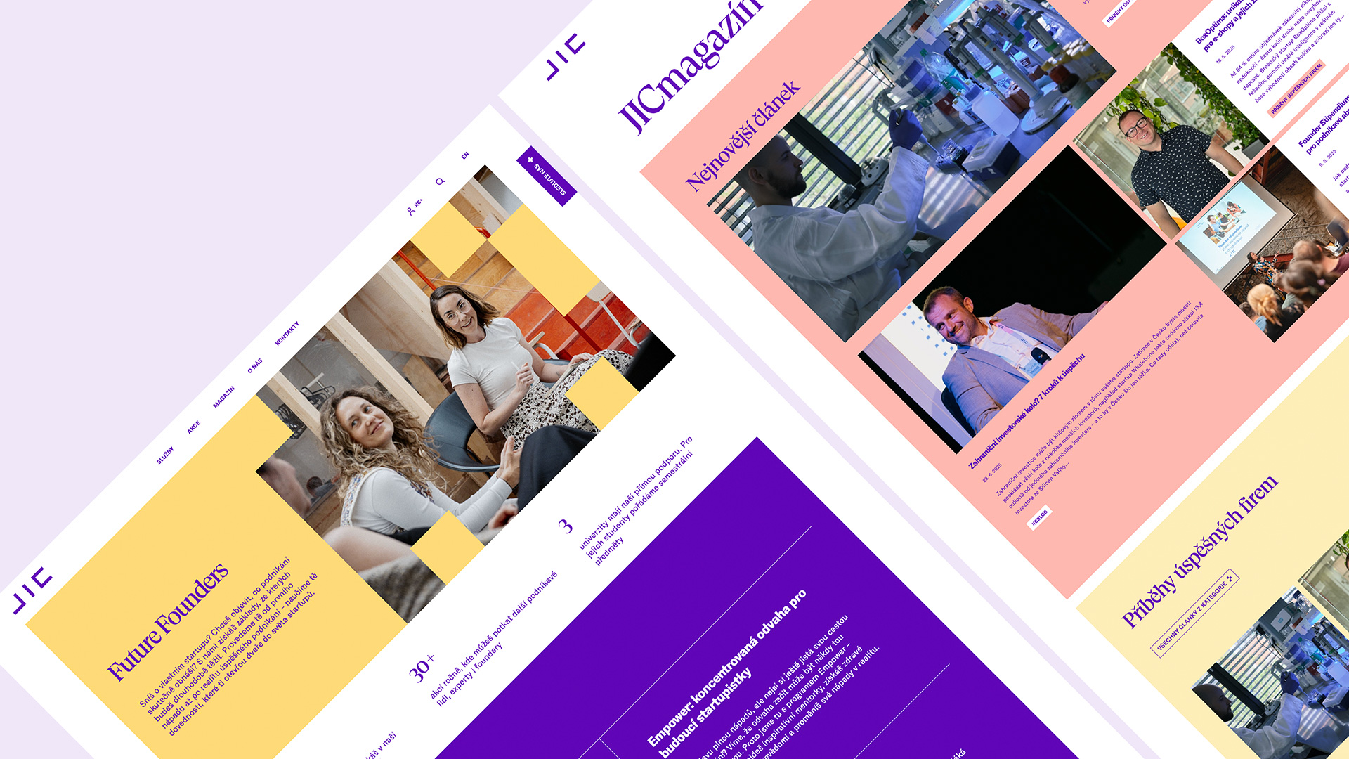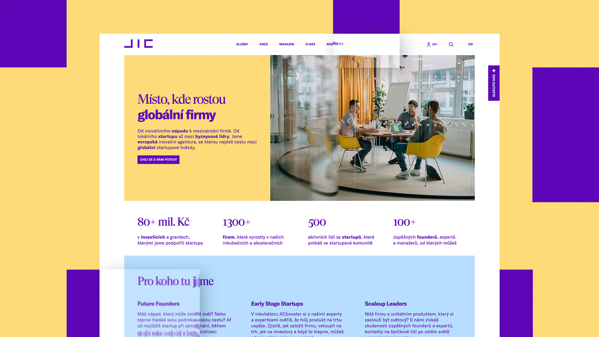 K jeho klientům patří jak začínající startupisté, tak zavedené firmy z jihomoravského regionu. Jedním z klíčových prezentačních nástrojů JICU jsou jeho webové stránky. S novým vizuálem se rozhodl redesignovat i webové stránky a přejít na profesionálnější řešení. Proměnili jsme je proto ve hravý moderní web reflektující značku JIC.